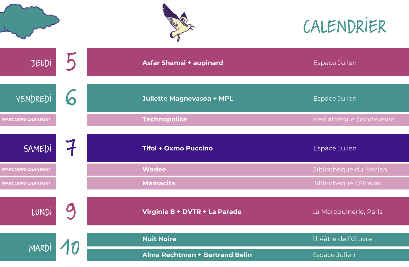 La programmation a toujours la même vocation de rassembler têtes d’affiches et nouveaux talents de la scène francophone devant le public marseillais, vitrollais et parisien.