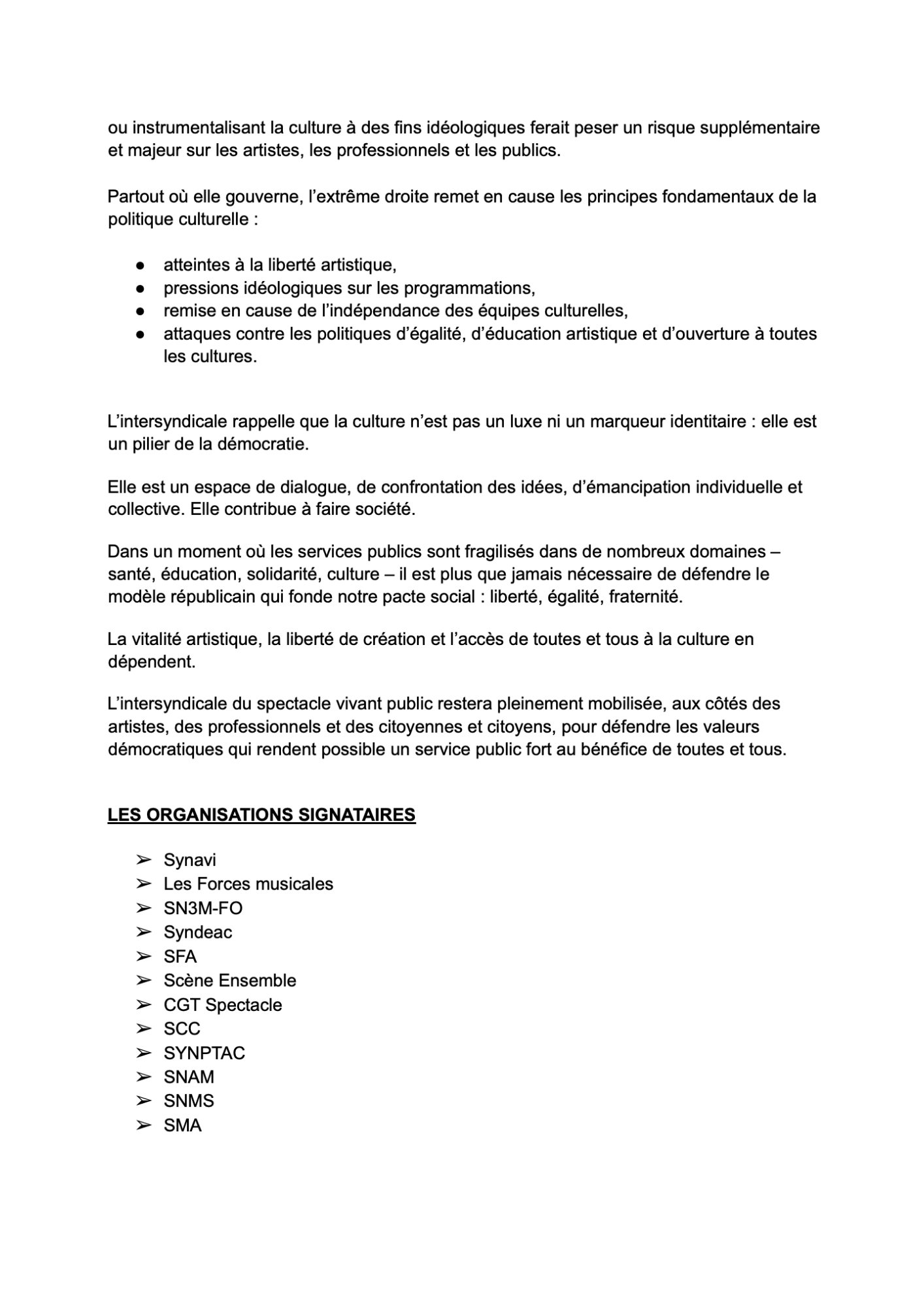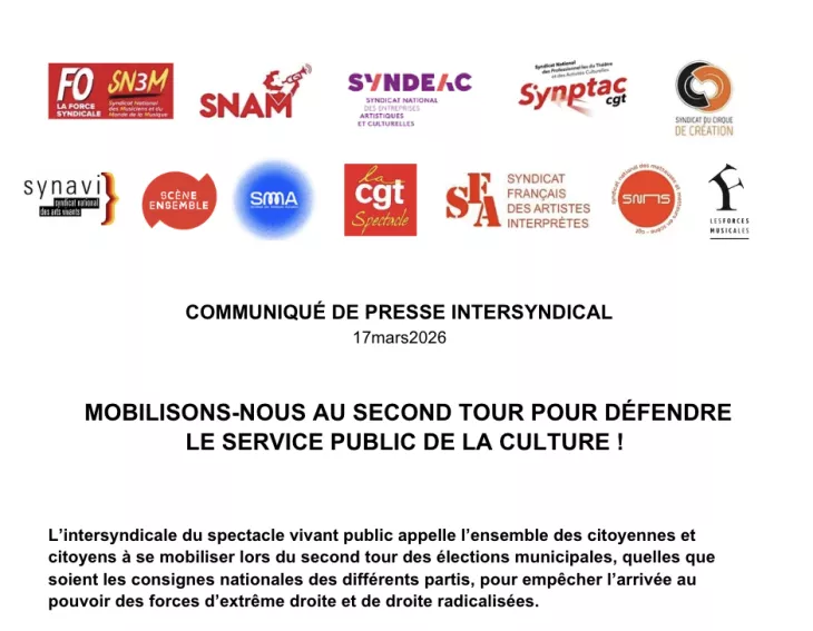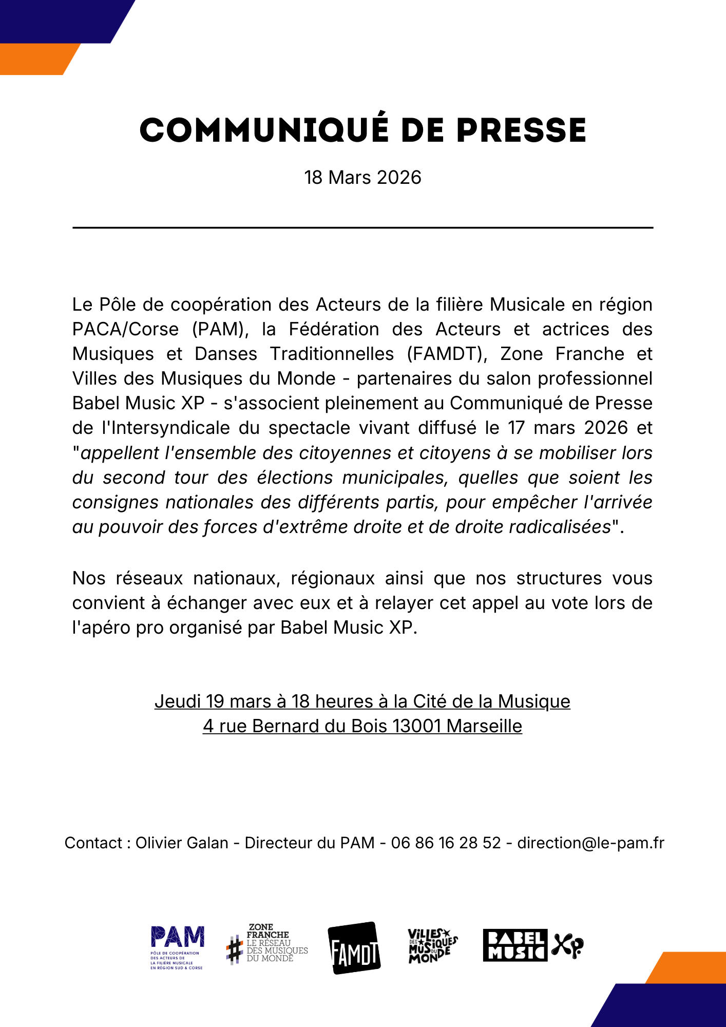 Le Pôle de coopération des Acteurs de la filière Musicale en région PACA/Corse (PAM), la Fédération des Acteurs et actrices des Musiques et Danses Traditionnelles (FAMDT), Zone Franche et Villes des Musiques du Monde - partenaires du salon professionnel Babel Music XP - s’associent pleinement au Communiqué de Presse de l’Intersyndicale du spectacle vivant diffusé le 17 mars 2026 et "appellent l’ensemble des citoyennes et citoyens à se mobiliser lors du second tour des élections municipales, quelles que soient les consignes nationales des différents partis, pour empêcher l’arrivée au pouvoir des forces d’extrême droite et de droite radicalisées".
