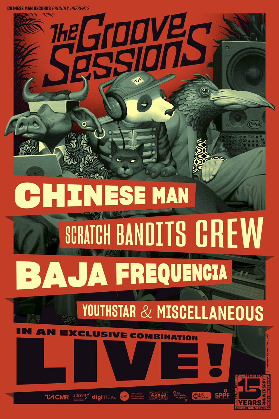A l’occasion des 15 ans du label indépendant Chinese Man Records, Chinese Man, Scratch Bandits Crew & Baja Frequencia se retrouvent en live pour une création commune autour du projet The Groove Sessions Vol.5 (sortie en février 2020).