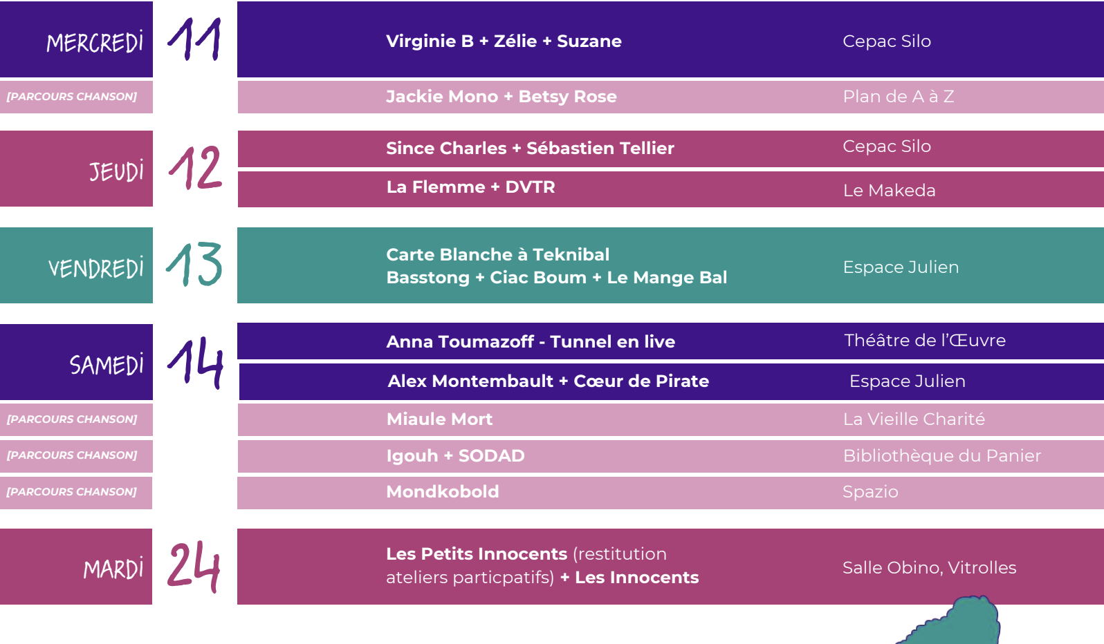 La programmation a toujours la même vocation de rassembler têtes d’affiches et nouveaux talents de la scène francophone devant le public marseillais, vitrollais et parisien.