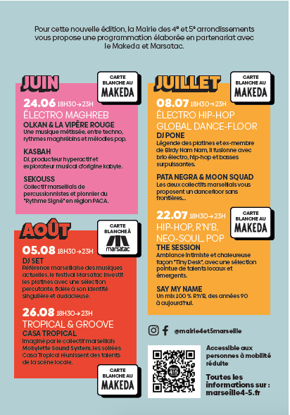 Pour le retour de l’été, Les Apéros 4&5, organisés par le Makeda en partenariat avec la Mairie du 4e et 5e arrondissement de Marseille, reviennent ! Ils prennent place au sein de la verdure du Parc Longchamp pour lancer la belle saison en musique !