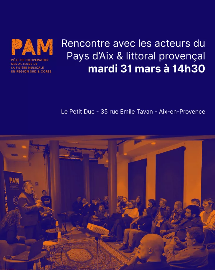 L’équipe du PAM propose des rencontres territoriales avec les acteurs de la filière. Composées de deux temps, avec une première partie où se réunissent les membres du PAM pour une rencontre conviviale, suivie d’une seconde partie avec les acteurs musicaux et collectifs non adhérents.