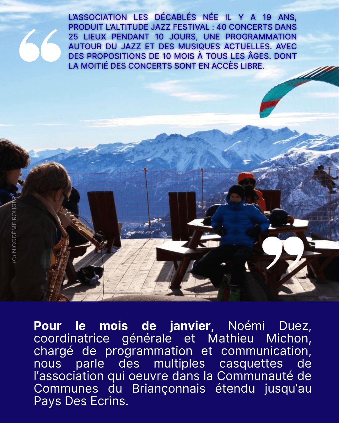 Il y a 19 ans, naissait au cœur de l’hiver et des Hautes Alpes, un festival de jazz atypique par son caractère itinérant et sa direction artistique résolument tournée vers les talents émergents. L’association Les Décâblés est née. Le bien nommé Altitude Jazz Festival, qui prend ses quartiers chaque année dans les montagnes du Grand Briançonnais à la mi-janvier, est porté par une équipe associative et bénévole passionnée et occupe un espace important dans le calendrier et la vallée du Briançonnais.