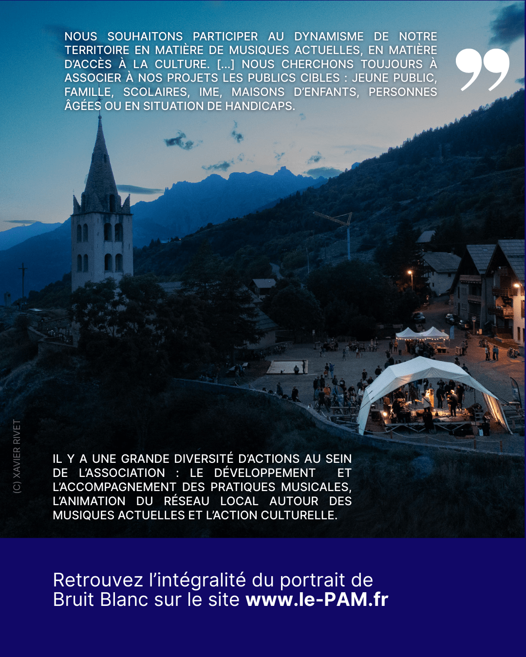 La culture est gage d’ouverture, d’économie locale, de dynamisme territorial. Le projet Bruit Blanc a été imaginé avec toutes les forces disponibles qui nous entourent, en coopération et en collaboration avec différents domaines d’actions (le tourisme, le social, la culture).