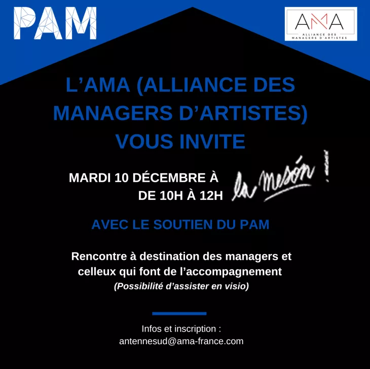 L’antenne de l’AMA (alliance des managers d’artistes) en Région Sud, avec le soutien du PAM, organise la prochaine rencontre des Managers d’artistes qui aura lieu le mardi 10 Décembre de 10h à 12h à La Meson (52 rue Consolat, 13001 Marseille).